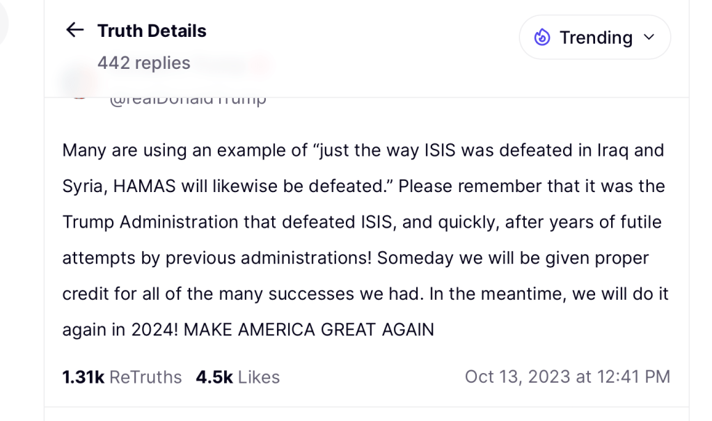 Many are using an example of “just the way ISIS was defeated in Iraq and Syria, HAMAS will likewise be defeated.” Please remember that it was the Trump Administration that defeated ISIS, and quickly, after years of futile attempts by previous administrations! Someday we will be given proper credit for all of the many successes we had. In the meantime, we will do it again in 2024! MAKE AMERICA GREAT AGAIN