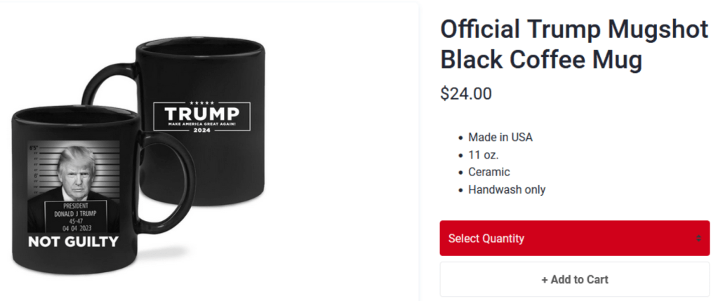 Trump may be the only person who has a police mugshot on a mug. You can purchase various versions, pro or anti-Trump, from a number of companies. No doubt Trump wants you to buy them from him here: