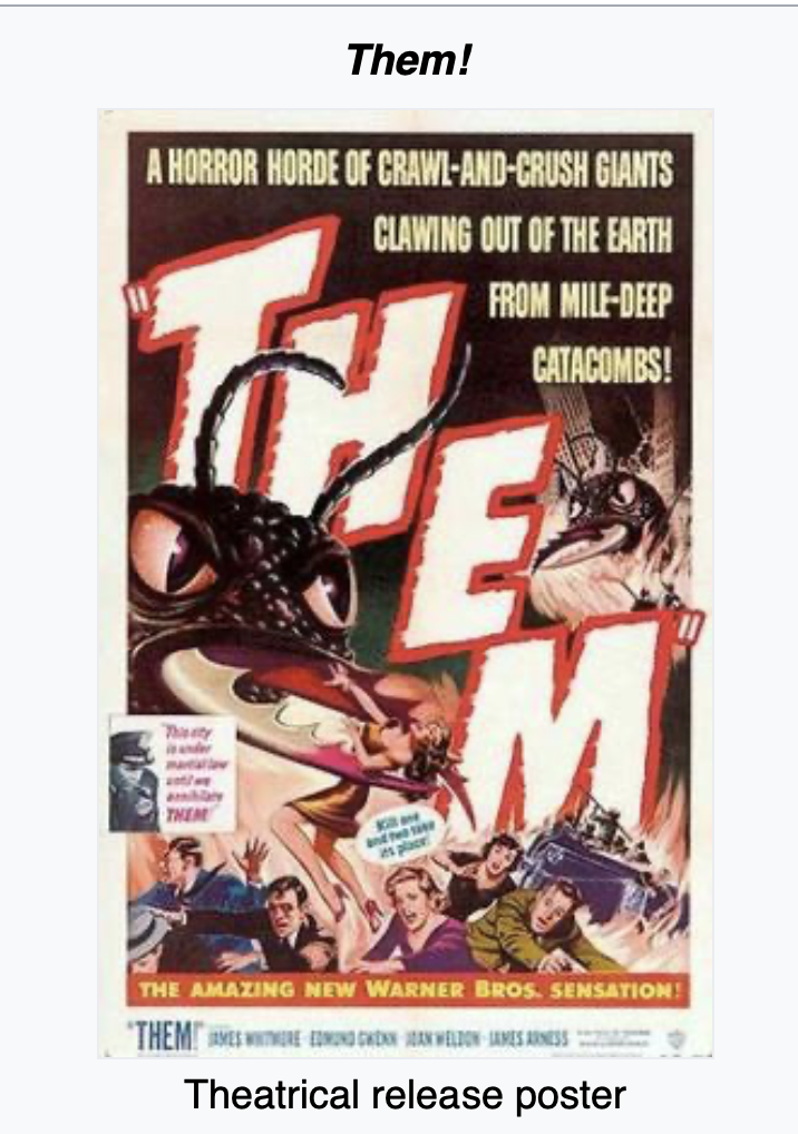 This sends an ominious message about “them” no doubt meaning what he’s called by various names like the deep state, commies, socialists, Marxists, and without a sense of irony, fascists. When he sounds the alarm that “they’re after you” he wants you to be as terrifed of them, them, as if they are like the deadly bugs who invaded earth’s surface from where they lived in mile deep catacombs in the 1954 black and white sci-fi monster film “Them” (Wikipedia). They’re after you, what out for them!