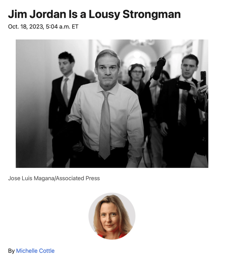 Mr. Jordan clearly fancies himself more of a Trumpian strongman. He has never been a leader or a serious legislator but is, rather, a career pugilist who seems developmentally stuck in his glory days as a high school and college wrestler. When nominating him on the House floor Tuesday, Elise Stefanik (one of the more painful cautionary tales about the corrosiveness of Trumpism) felt compelled to cite his mad skills “on the wrestling mat.” Seriously? The guy is pushing 60, and we’re still yammering about his teenage takedowns? And not to be indelicate, but do Republicans really want people thinking all that hard about Mr. Jordan’s wrestling baggage?