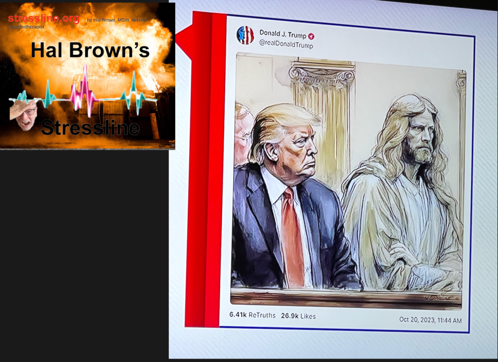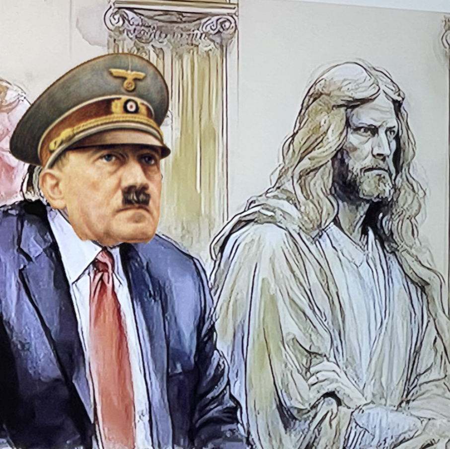 The screenshot above is from the discussion with Ruth Ben-Ghiat who is an expert on fascism and authoritarian leaders, on The Ali Velshi Show this morning about Trump haing posted an image of himself sitting in a courtroom next to Jesus. It doen’t take me long these days to prove Godwin’s Law when it comes to Trump and make then make a reference Hitler.