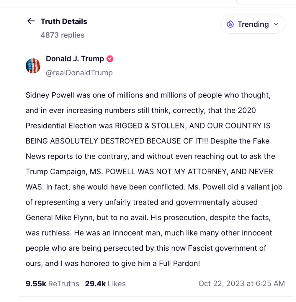 In a Sunday morning post on Truth Social, the former president straddled the line between defending Powell and trying to distance himself from the attorney, who was a key figure in Trump’s 2020 “Stop the Steal” efforts.