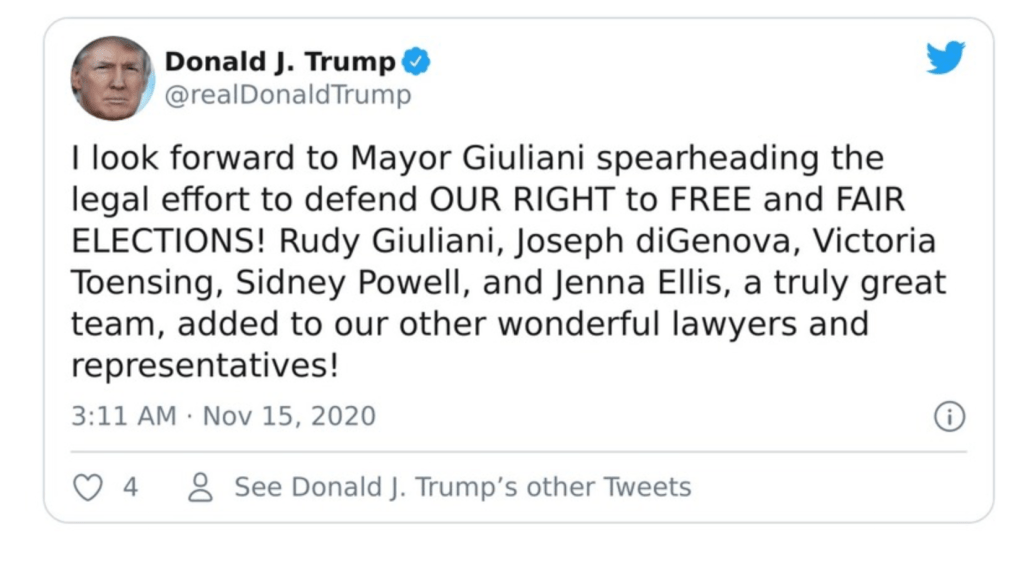 This is what Trump posted on Twitter on Nov. 20, 2020 announcing that Sidney Powell was added to his “truly great team” led by Rudy Giuliani.