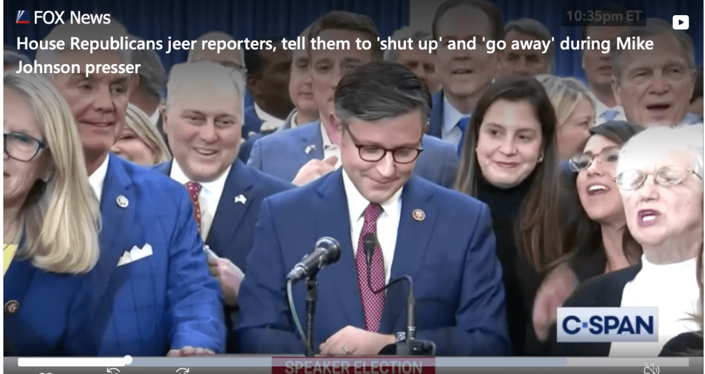 Johnson will also be subject to reporters questions and won’t be able to get away unscathed with blowing them off (above) with an 80 GOP white haired repsentative screaming and providing Democrats with an ad showing how they booed ABC reported Rachel Scott for asking about his role in trying to overturn the election.