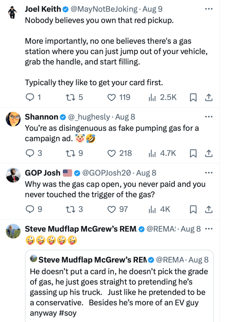 Here’s another article: Mike Pence is getting ridiculed online for a campaign video where he pretends to pump gas into his pickup truck for a full minute.
