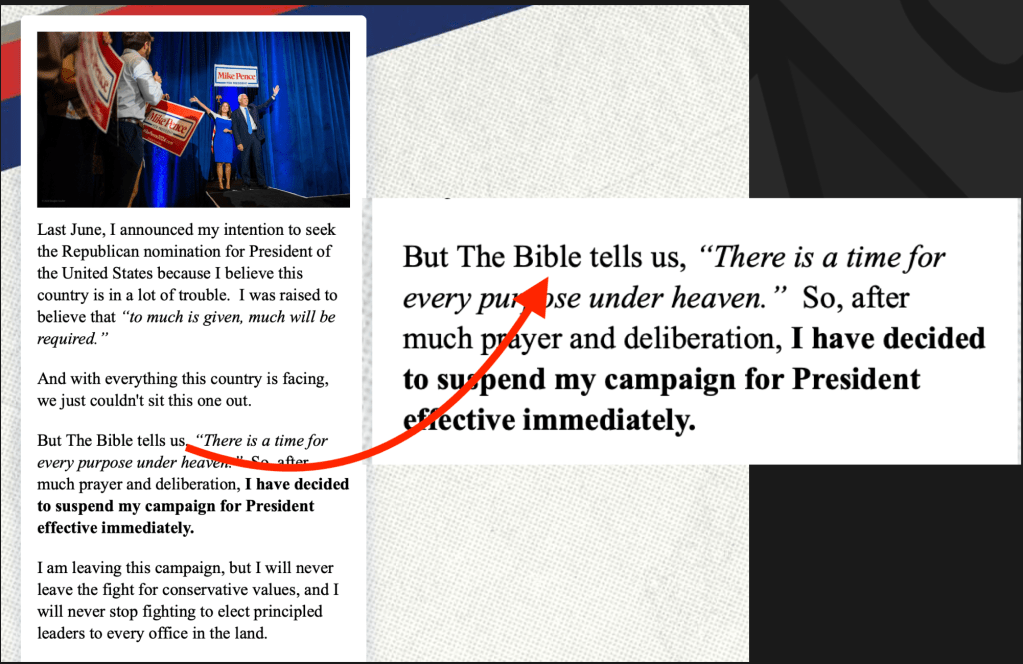 I assume that his website designer peeps didn’t get the message or that Pence is being Trump-like in trying to grift more money even though he isn’t running anymore.