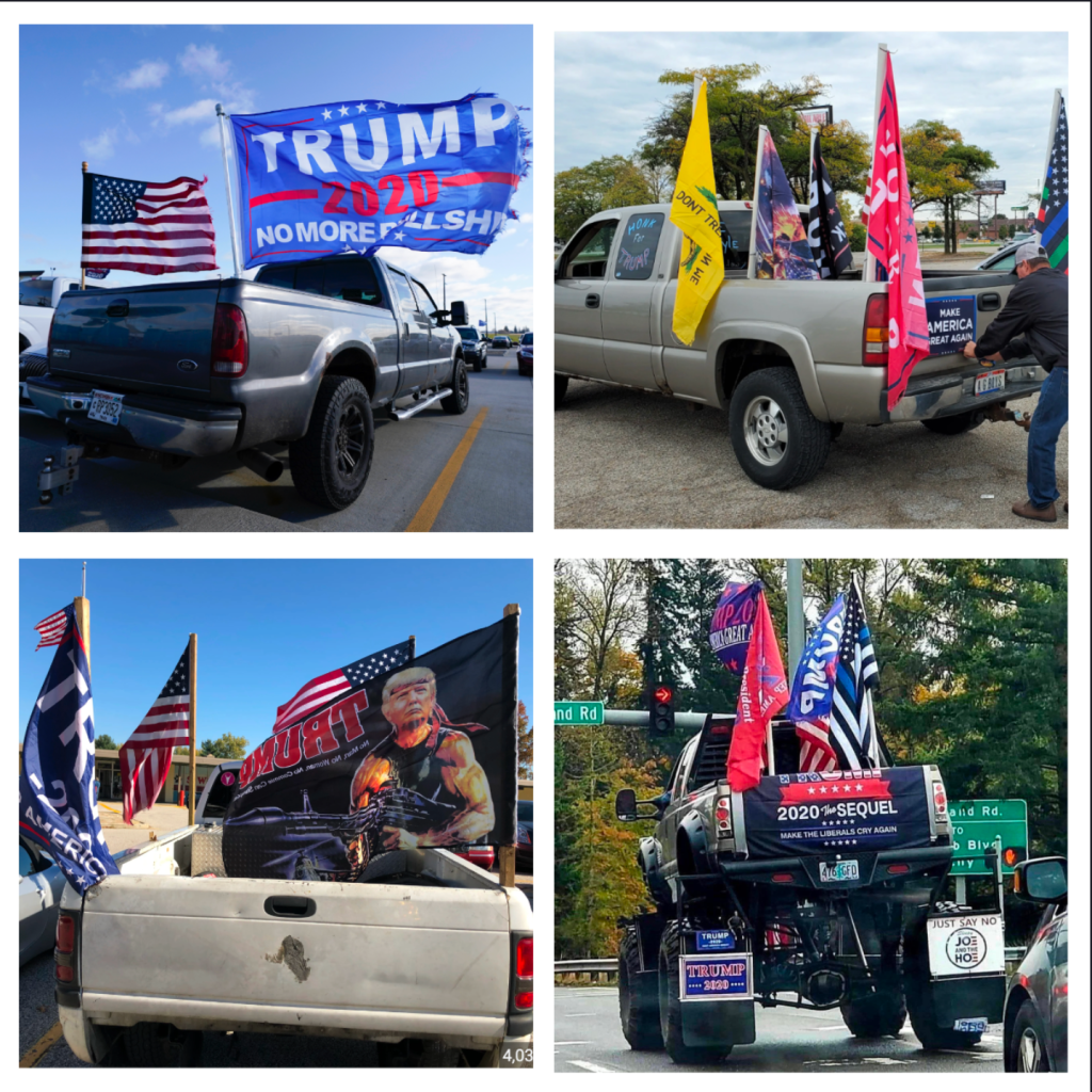 Pickup trucks festooned with Trump flags have become ubiquitous. I have my doubts that the majority of people who own these trucks actually need them for work or use them for off-road driving (for example, lower right below).