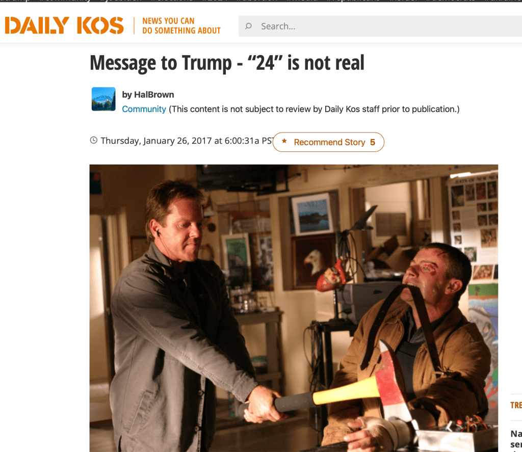 This inspired me to republish a piece I posted on Daly Kos on Jan. 26, 2017 titled “Message to Trump – “24” isn’t real.