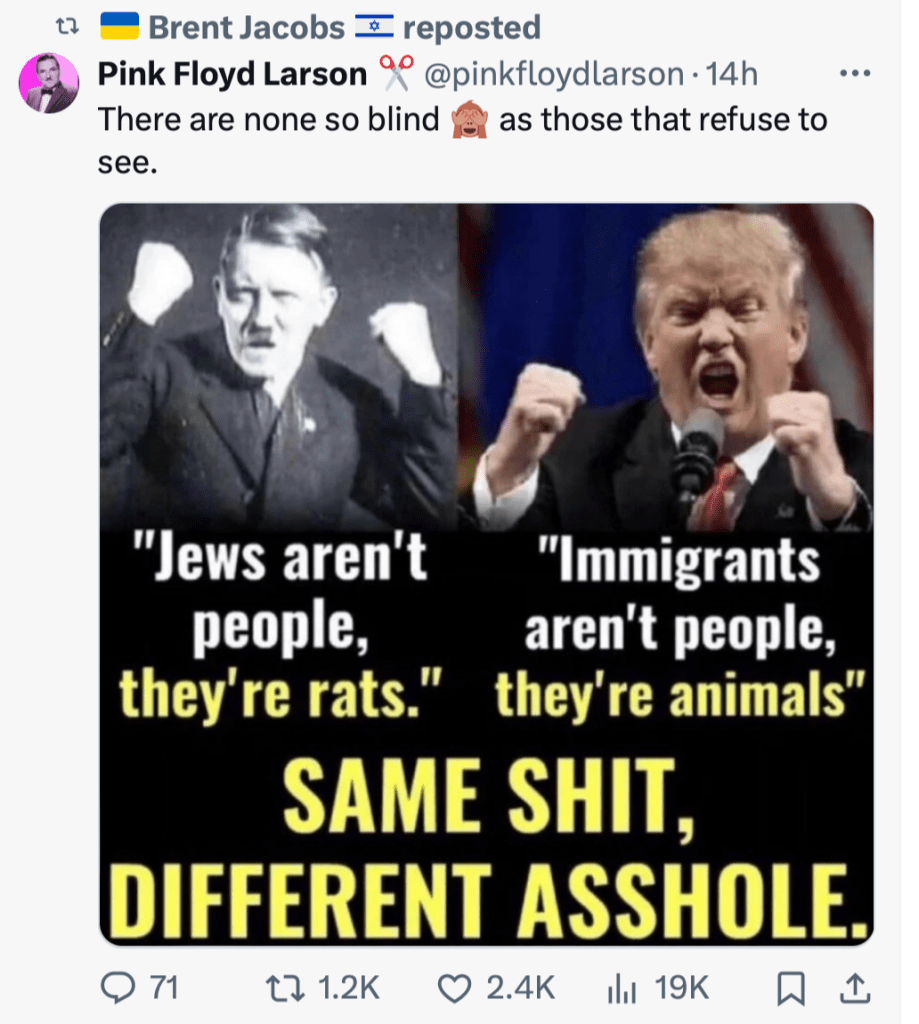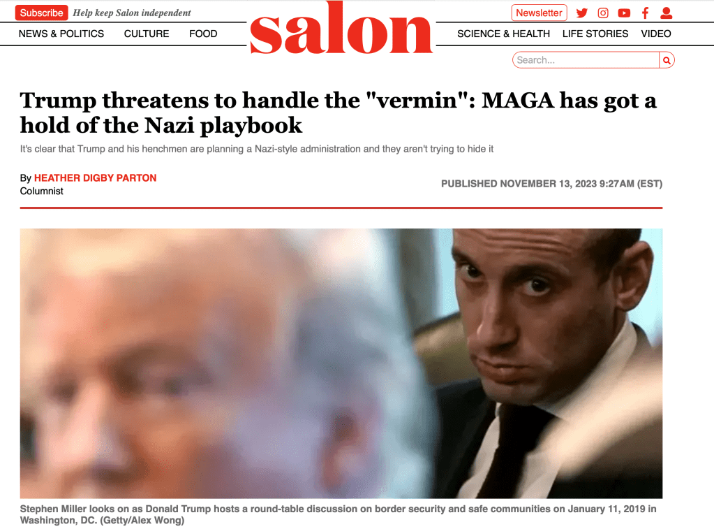If I had to guess, I would say that Trump didn’t come up with that word (vermin) himself. He’s more of a “rats” guy than a “vermin” guy when it comes to rhetoric. And the fact that he repeated the exact phrase from the teleprompter at a rally later in the day on Saturday indicates that it was a speech writer’s work not his own, although it certainly reflects his feelings on the matter. I suspect it was either written or inspired by his righthand fascist, Stephen Miller, featured heavily in yet another chilling article in the New York Times about the Trump agenda for his second term…. It’s clear that Trump and his henchmen are planning a Nazi-style administration and they aren’t trying to hide it. His campaign told the Times to speak to Miller who generously shared his agenda with the paper. They want people to know what they are plotting. This time no one should assume that it’s just hyperbole. As Miller told the Times, ‘bottom line President Trump will do whatever it takes.” Don’t doubt it.