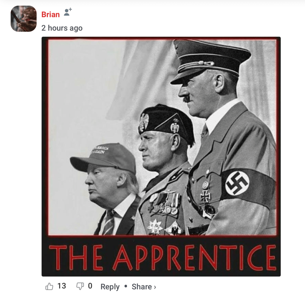 There are lots of images comparing Trump to Hitler and sometimes Mussolini.