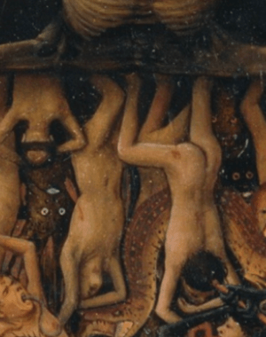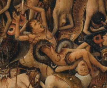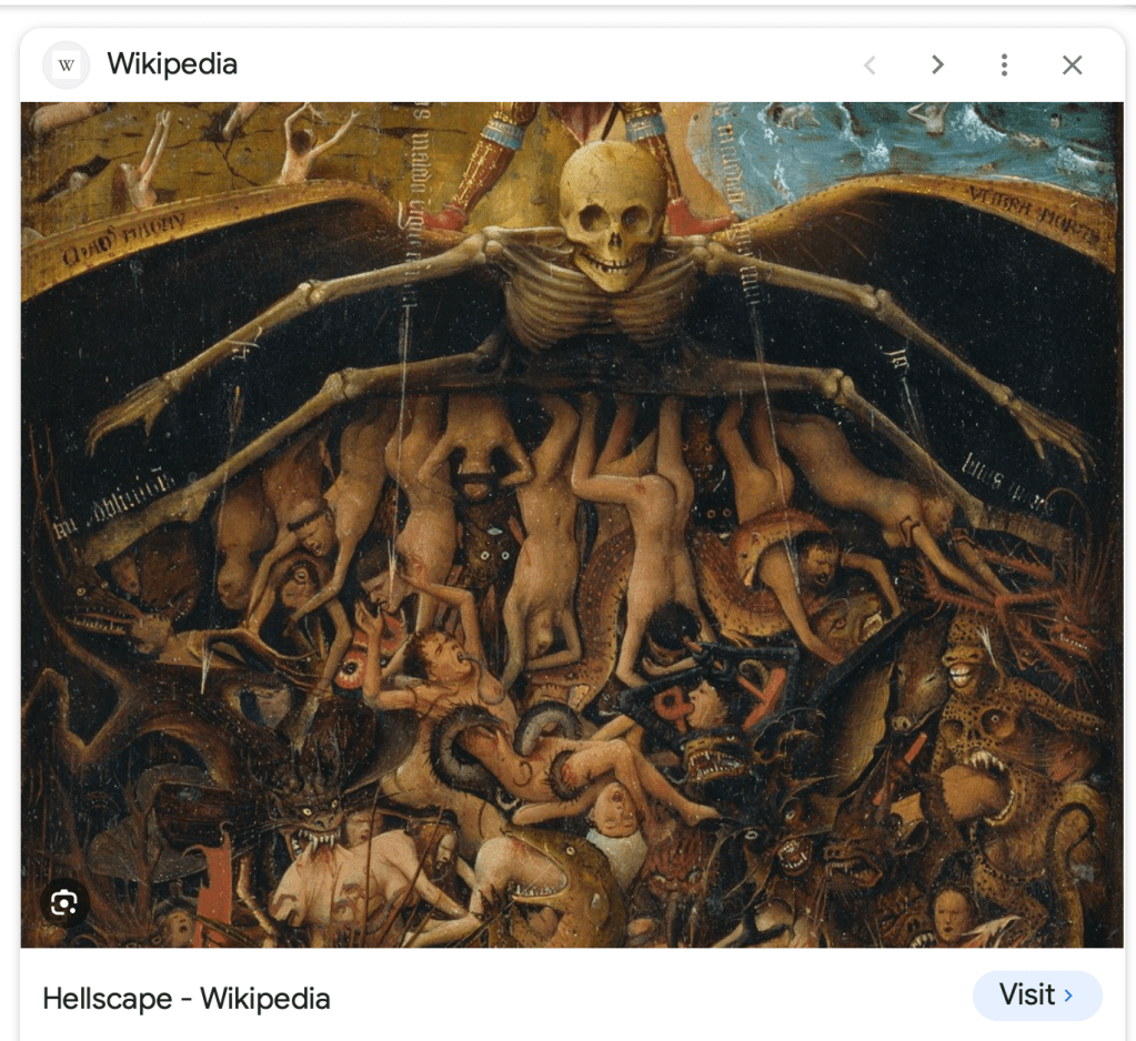 There are numerous images of hellscapes (see a Google Images search here) but a well known one is in the public domain. It is featured on “hellscape” in Wikipedia (here). It is a detail of Crucifixion of Jesus Day of Judgment from the Jan van Eyck Diptych .
