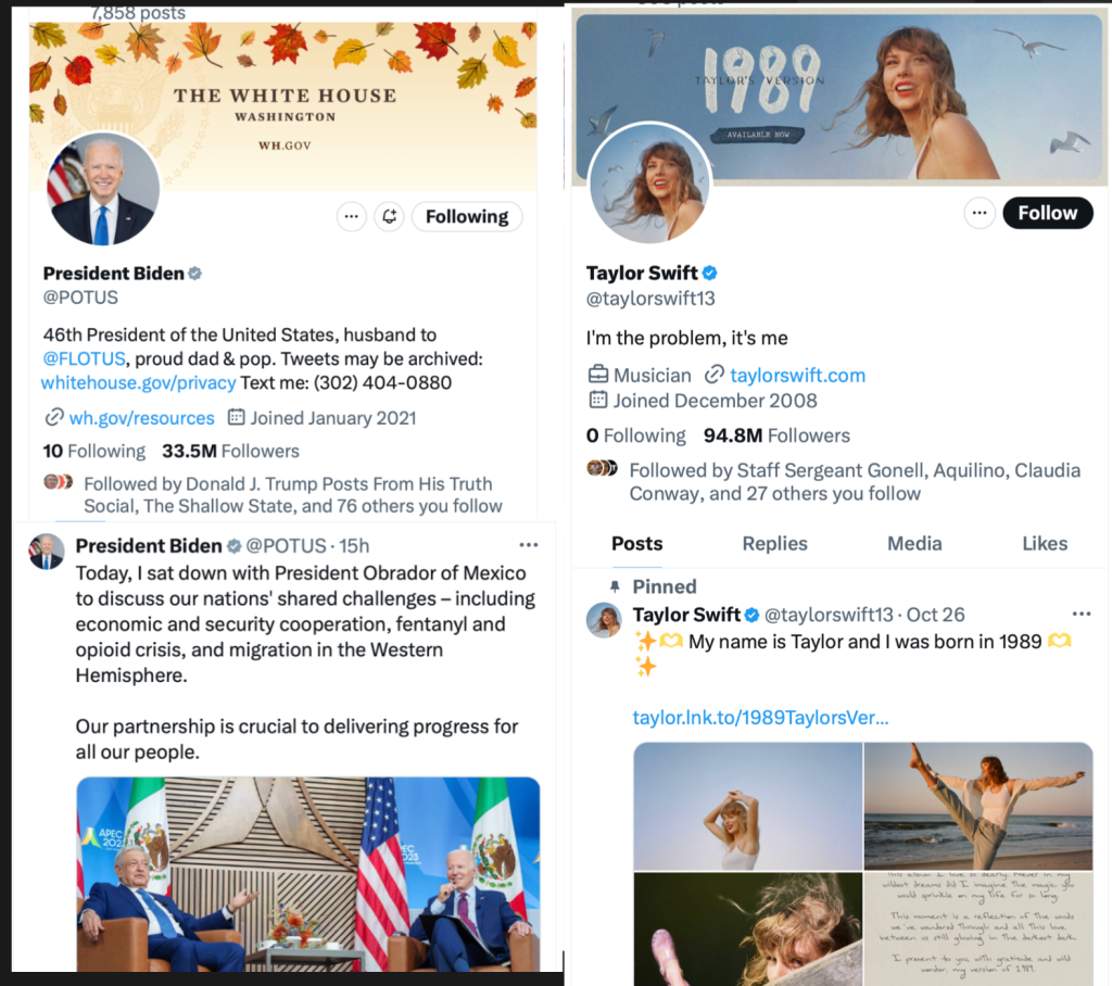 This is because just about anyone in the news who you can think of posts on X including President Biden and Taylor Swift.