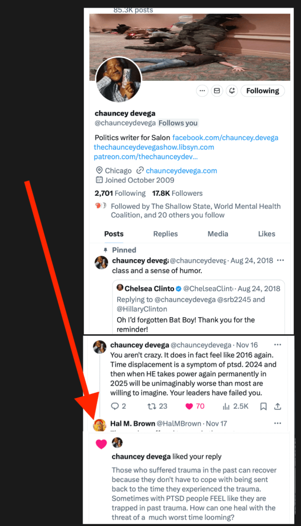 Yesterday I posted a reply to something one of my favorite columnists, Chuancey DeVega of Salon posted on his X page. I’ve done this about a dozen times with him before and each time he has “liked” my post. This shows that he read it.