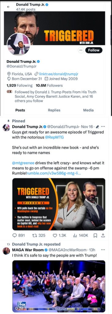 Instead Trump started his own rip-off platform, Truth Social. Even so, he has many surrogates posting on X. For example: