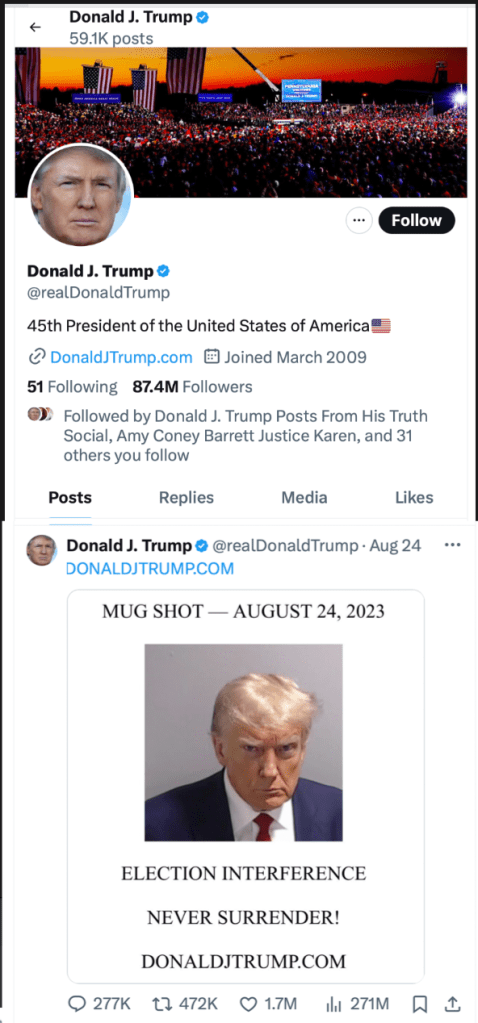 While some major advertisers are expressing their objections to what Musk is doing by at least pausing their advertising there I haven’t seen any news stories about a major poster on X refusing to post there. The last person who made the news for doing this was Donald Trump after his account was reinstated by Musk. His last post there was on August 23, 2024: