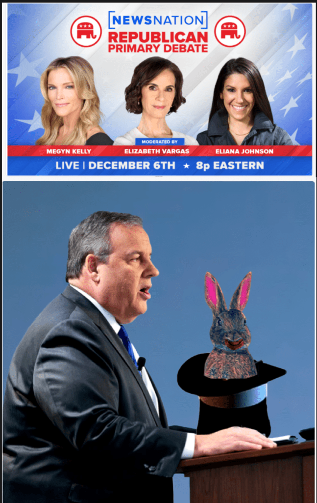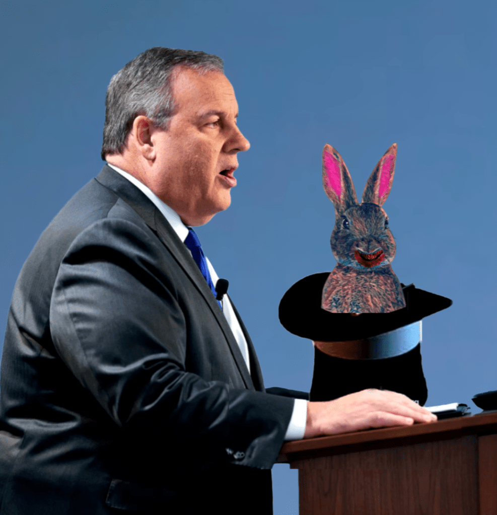 Christie needs to have a breakout performance. He has to go well beyond pulling a cute bunny rabbit out of his hat. He must surprise everyone with something besides his usual sales pitch of sane competence. He has to reach into his magical hat and instead of pulling out a cuddly bunny rabbit he has to pull out a really unexpected rabbit out of his hat.