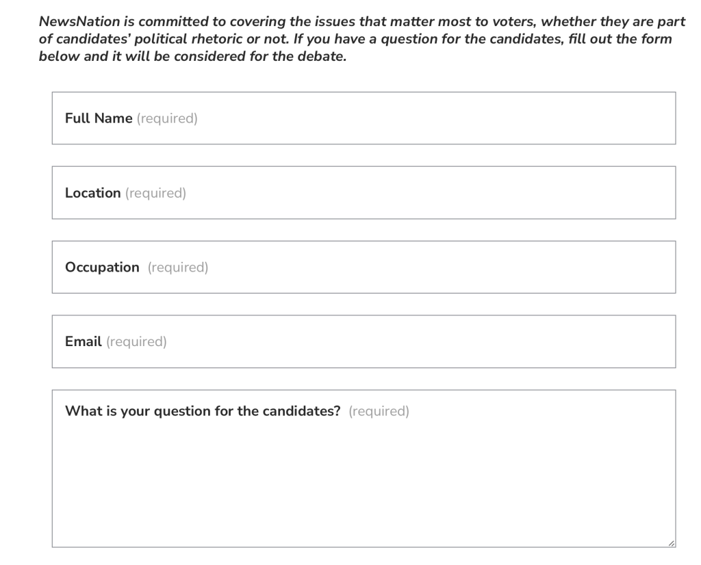 The debate will be in Tuscaloosa, at the University of Alabama and hosted by NewsNation, a rightwing cable channel I’d never heard of. See Wikipedia. Anyone can submit a question to be considered for the debate on the NewsNation website here.