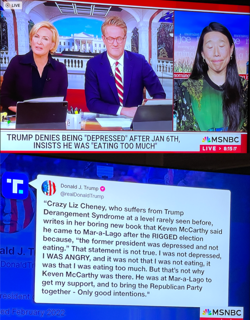Joe and Mika had Katy Benner on when they talked about Trump’s reaction to Liz Cheney saying he was depressed after losing the election, and to reports that Kevin McCarthy visited him in Mar-a-Lago because he wasn’t eating. Katy Benner was an English major at Bowdion College in Maine. She’s an excellent journalist but she isn’t a psychologist.