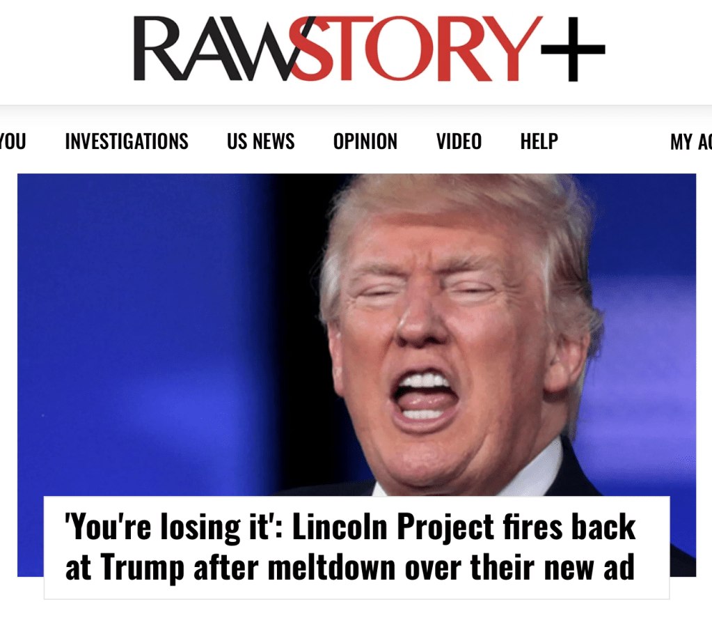 Click here: ‘You’re losing it’: Lincoln Project fires back at Trump after meltdown over their new ad.