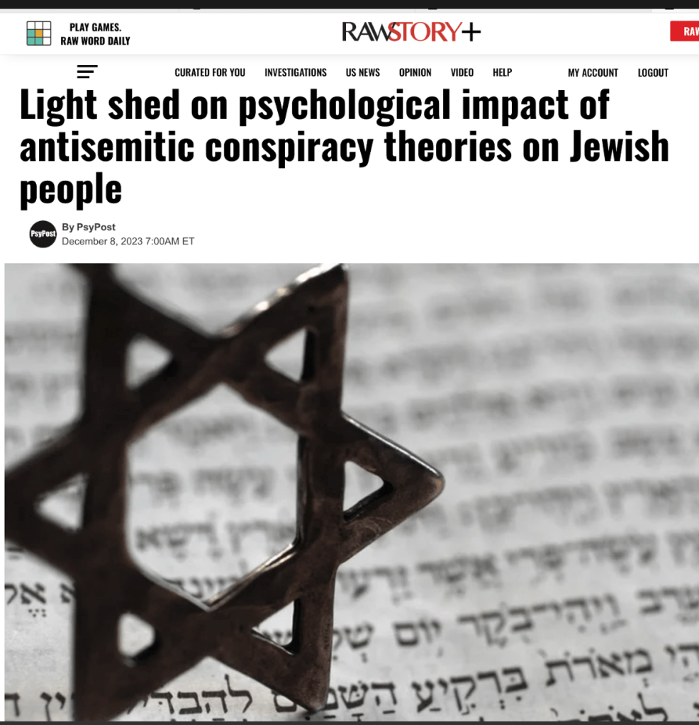 The PsyOp website summary of the original British Journal of Psychology article is good, but it doen’t give examples of the conspiracy theories about Jews some people believe. These have been expressed more frequently since Oct. 7th. Here are the two beliefs published in the journal: