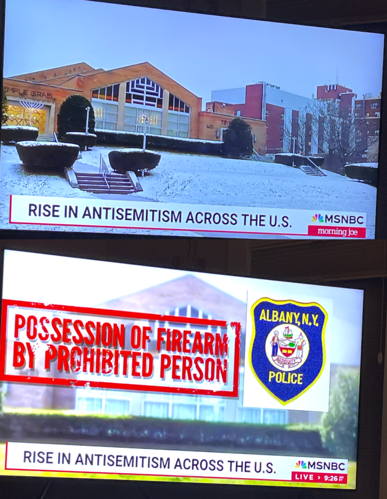 As I write this MSNBC is reporting on this story: Man accused of firing shotgun outside synagogue in upstate New York is taken into custody, police say.