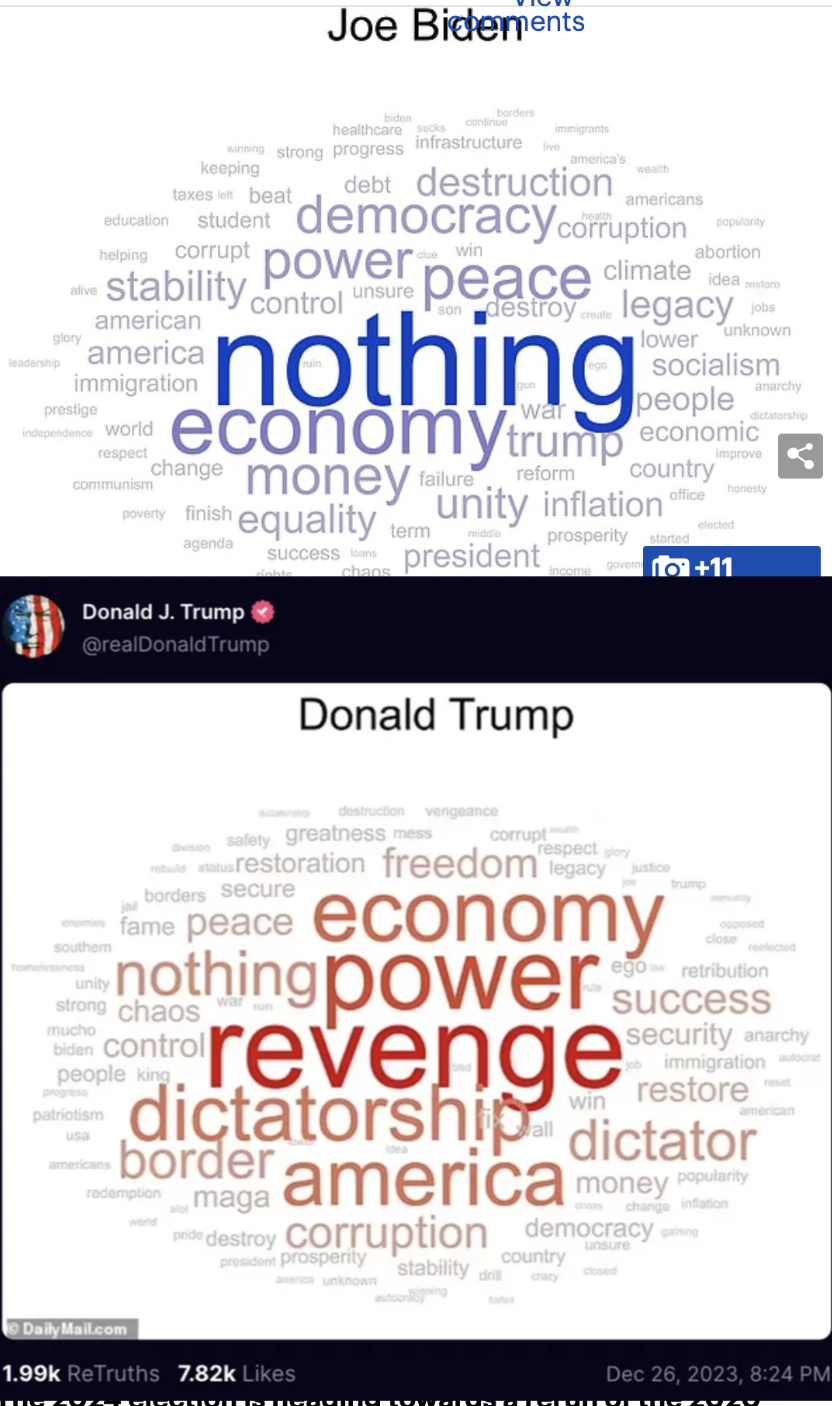 The artile from The Daily Mail, “Voters describe their 2024 choice between a Trump second term and a Biden second term as a choice between REVENGE or NOTHING in Daily Mail poll.”
