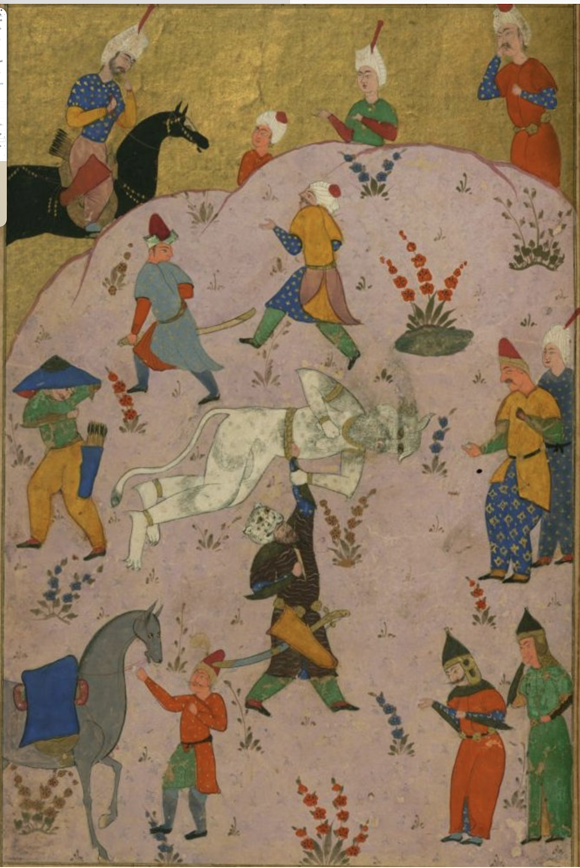 The greatest Persian mythical hero Rostam undertakes his “Seven Labors” to free his sovereign. At the end, Rostam slays Div-e Sepid and uses his heart and blood to cure the blindness of the king and the captured Persian heroes. Rostam also takes the Div’s head as a helmet and is often pictured wearing it.