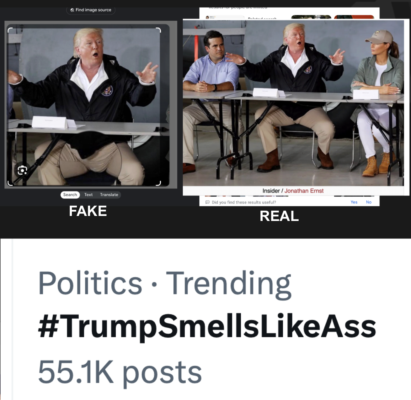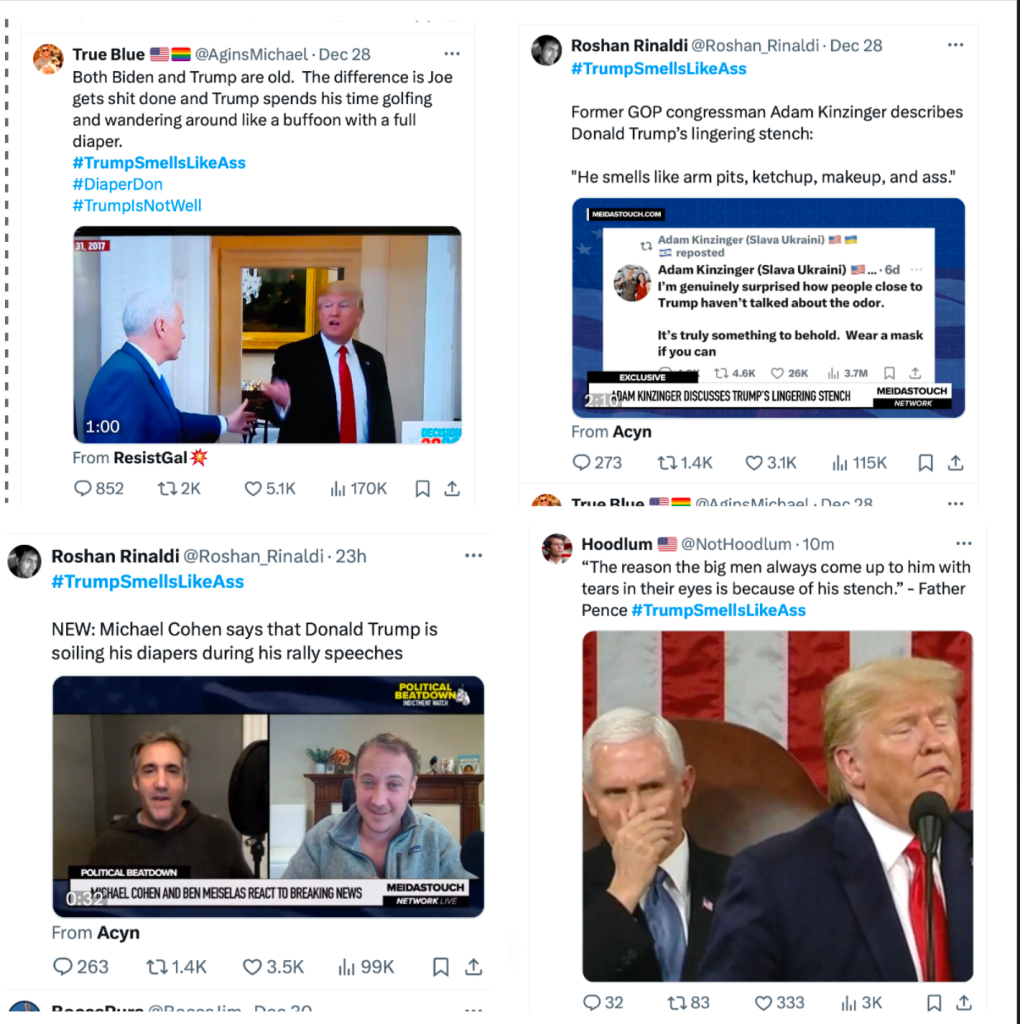 I know that many of you refuse to look at Twitter/X now that Musk has turned it into an unregulated venue for hate-mongers. These are four of the posts there under a Trump smells hashtag (click to enlarge).