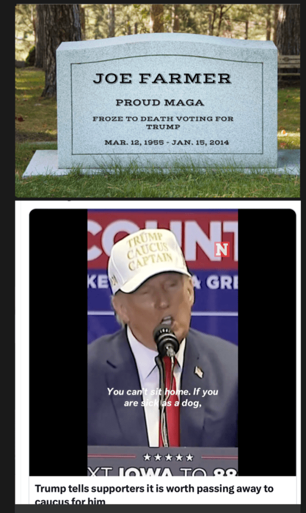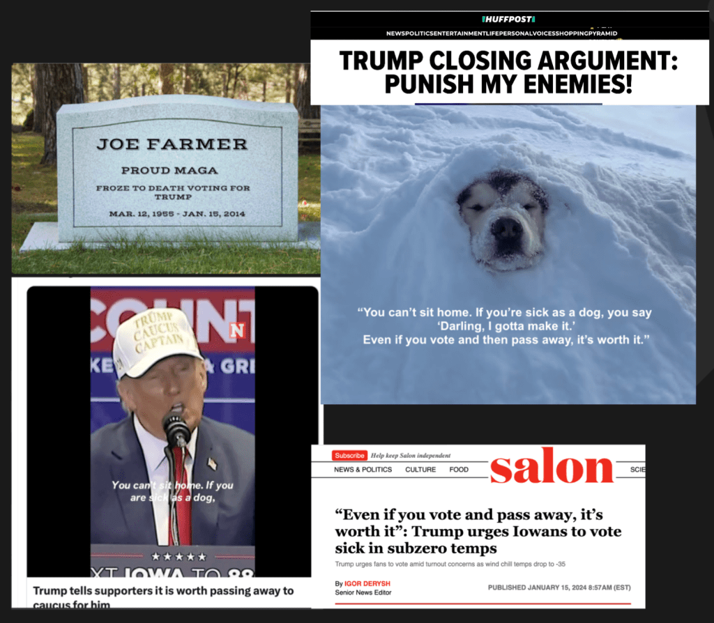 In Salon Igor Derysh wrote “Even if you vote and pass away, it’s worth it”: Trump urges Iowans to vote sick in subzero temps.