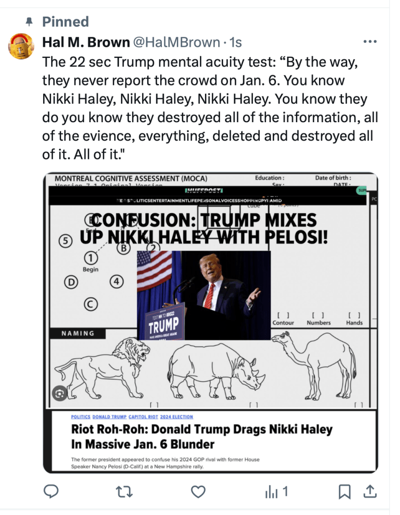 As the report points out, the former president brought up the test before a New Hampshire crowd this week, explaining, “I think it was 35, 30 questions. They always show you the first one, like a giraffe, a tiger, or this, or that — a whale. ‘Which one is the whale?’ Okay? And that goes on for three or four [questions] and then it gets harder and harder and harder.”