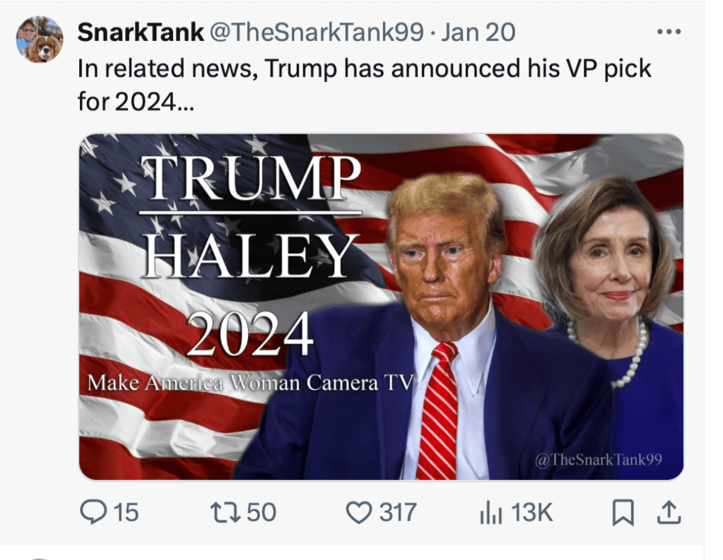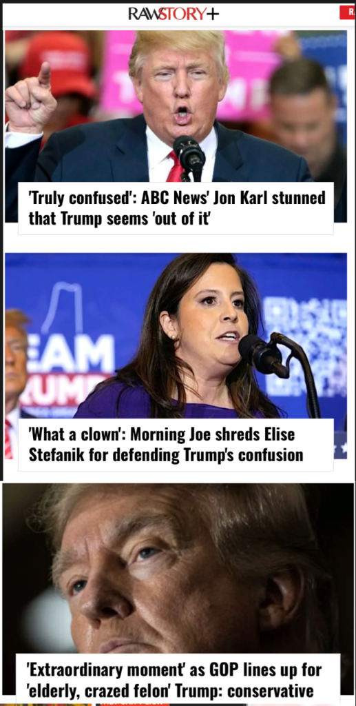 While Nikki Haley probably dosen’t read RawStory she is no doubt aware of the the wide reporting on all of the reporting on Trump using terms like “truly confused”, “Trump’s confusion”, and “elderly, crazed, felon.” Morning Joe said his mind is scrambled eggs and the editor of the New Republic asks if he’s losing his marbles .