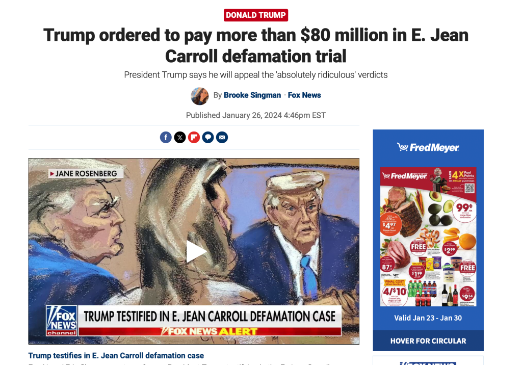 Viewers of Fox News may not know about the $83.3 million jury award to E. Jean Carroll unless they happen to tune in when it is being reported on (here).