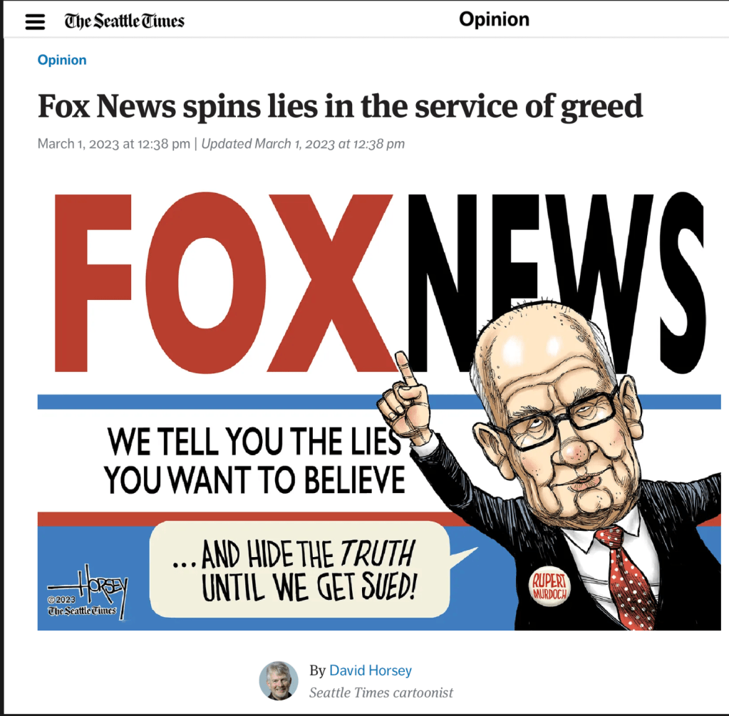 Murdoch and his amoral crew of hypocrites clearly are not in the news business. They are in the business of making gobs of money — “green” — any way they can, even if it devastates American democracy.