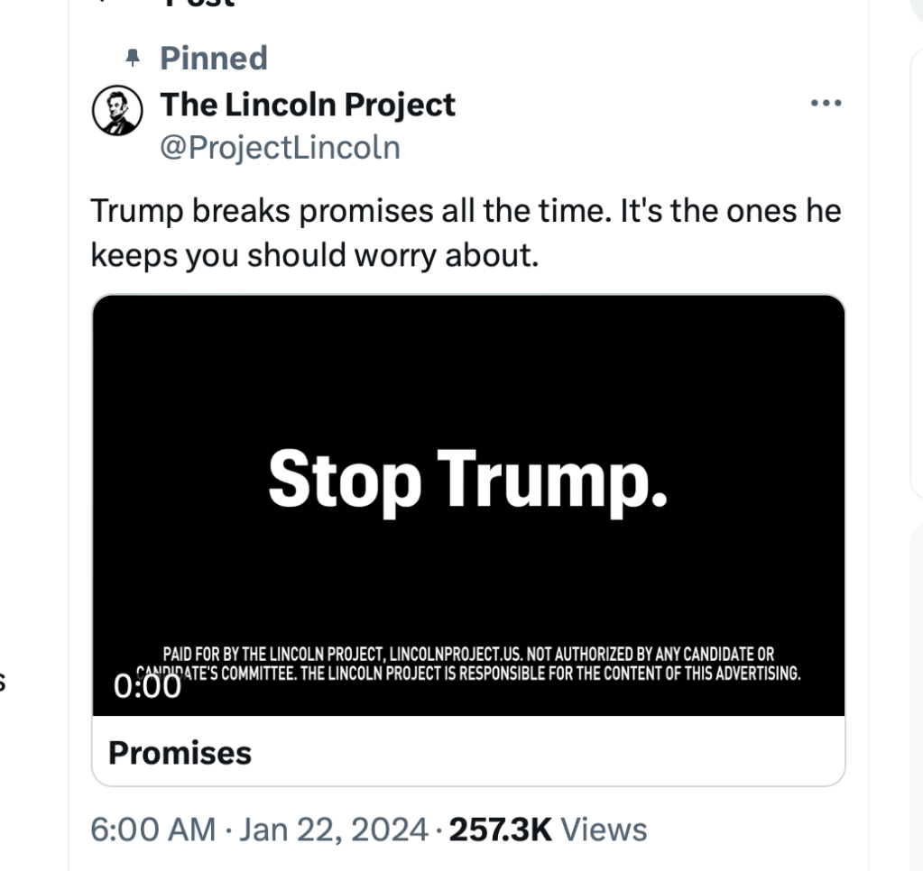 The LIncoln Project seems to have ample funds. Here’s their current ad from X(Twitter).
