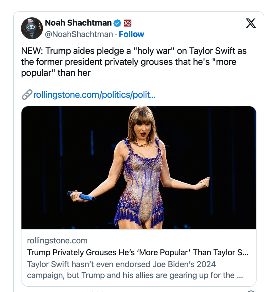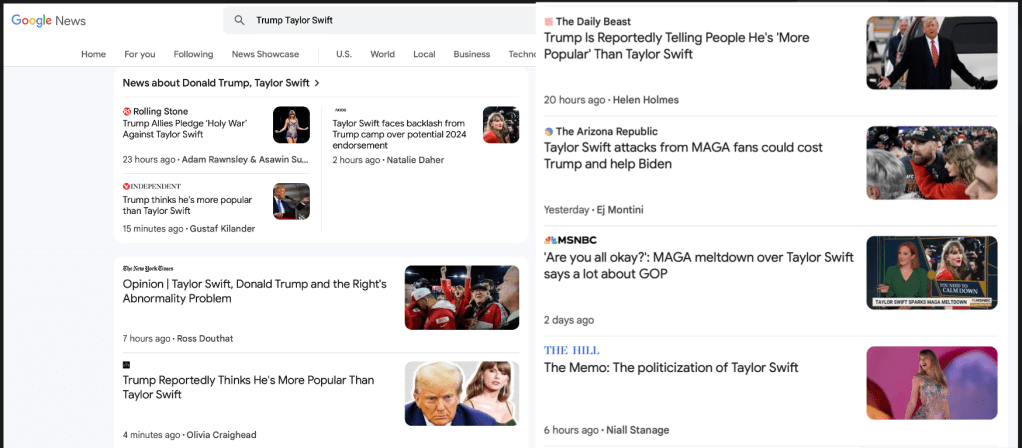 I can’t keep up with the artilces on a Google News search for Trump Taylor Swift.