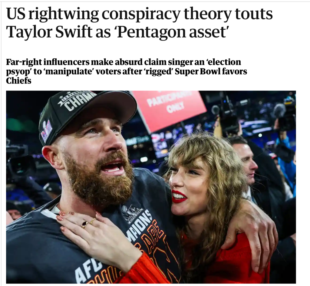 But within that hostile faction, her relationship with Kelce has transformed a merely unfavorable impression into outright paranoia, with various online influencers portraying the romance as some kind of carefully crafted political propaganda, whose true purpose is to make a Swift or Swift-Kelce endorsement of Biden’s re-election bid as meaningful as possible to Swifties and football fans alike.