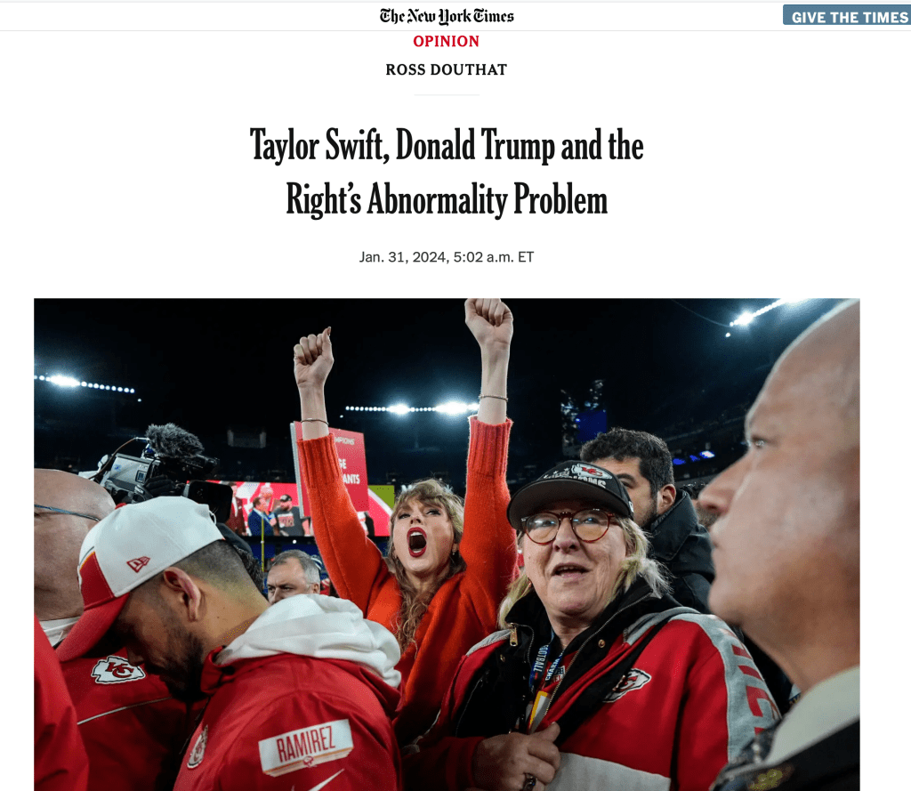 Trump himself is a great abnormalizer. But so are the various fixations and follies that take shape in his wake — like the very-online right’s bizarre reaction to the romance between Taylor Swift and Travis Kelce, a love story that’s united the two remaining pillars of our common culture: the National Football League and, well, Swift herself.