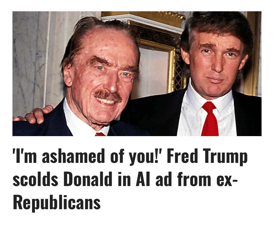 Watch the Lincoln Project ad featuring an AI generated Fred Trump disparaging and insulting his son Donald by clicking here or above and read the article about it in RawStory by clicking below.