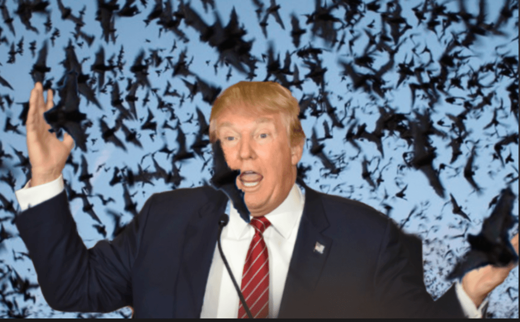 Sure, some anti-Trumpers will find the ad amusing and clever, but so what? Only if Trump himself sees it will it have any real effect and then only if it pushes him over the edge into an impossible to ignore psychotic break where he’s seen on national TV swatting at attacking vampire bats (above in my illustration which I admt is snarky but I mean this to be deadly serious) which only he can see and screaming “they’re trying to suck my blood.”