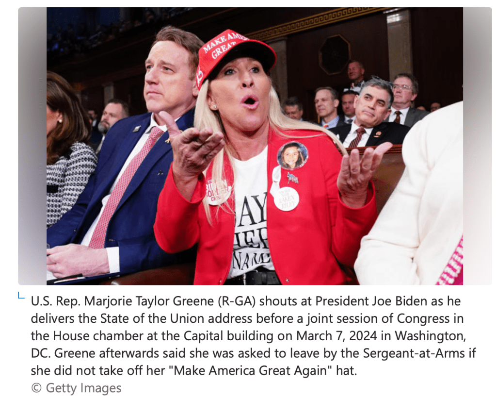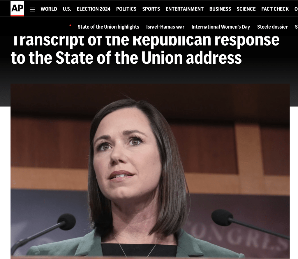 I’m sure that the GOP would prefer that Sen Katie Britt who gave the Republican response to The State of the Union address would be the face of the party rather than Marjorie Tayor Greene who managed to make the news by shouting out “say her name” referring to a woman murdered by an undocumented immigrant.