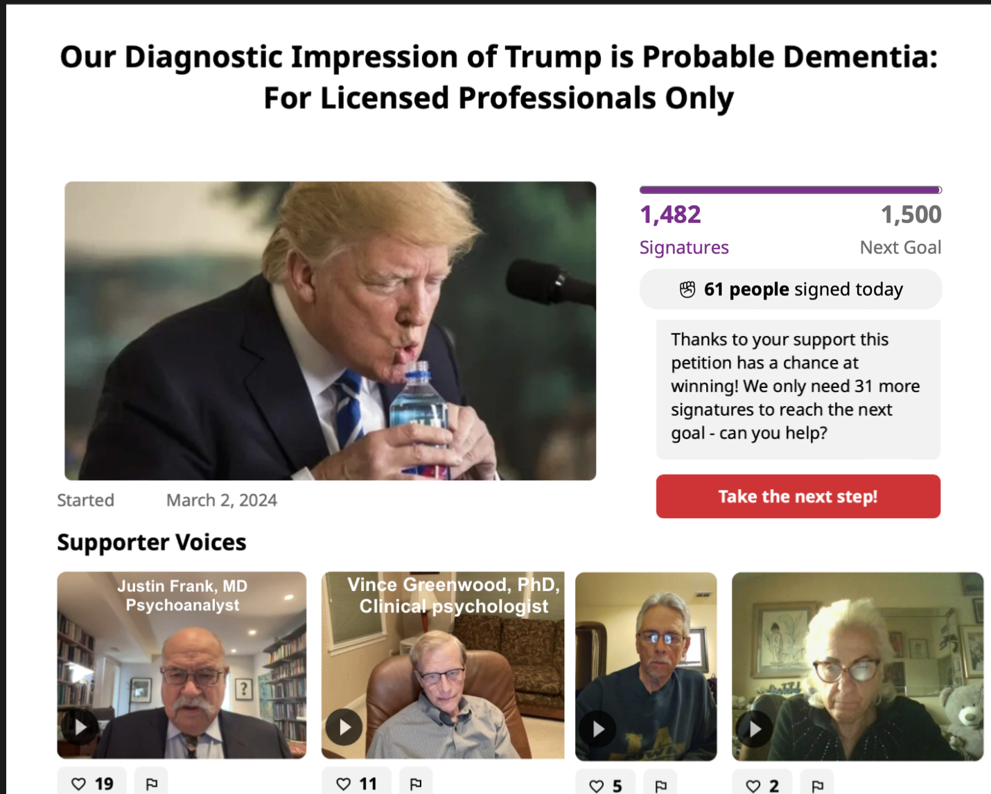 We, the undersigned licensed medical and mental health professionals (INCLUDE YOUR ADVANCED DEGREE IN YOUR LAST NAME WITH NO PUNCTUATION) concur: From our years of training and experience, we are convinced that, while a definitive diagnosis would require further testing, Donald Trump is showing unmistakable signs strongly suggesting dementia, based on his public behavior and informant reports that show progressive deterioration in memory, thinking, ability to use language, behavior, and both gross and fine motor skills.