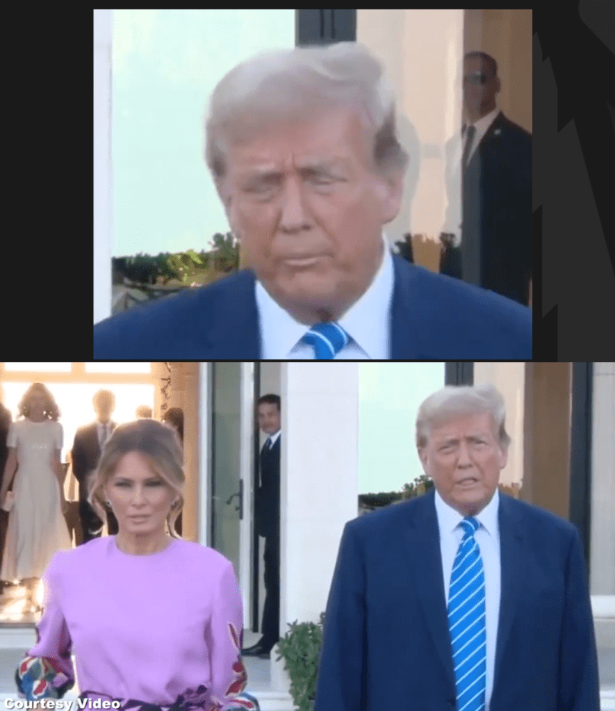 After Trump says “thank you very much for being here” with his voice trailing off you he shuts his eyes. I don’t know what that means. I can only speculate that he may just want to get away from the cameras showing him standing next to Melania. Perhaps they had a argument just prior to leaving for the fund raising event.