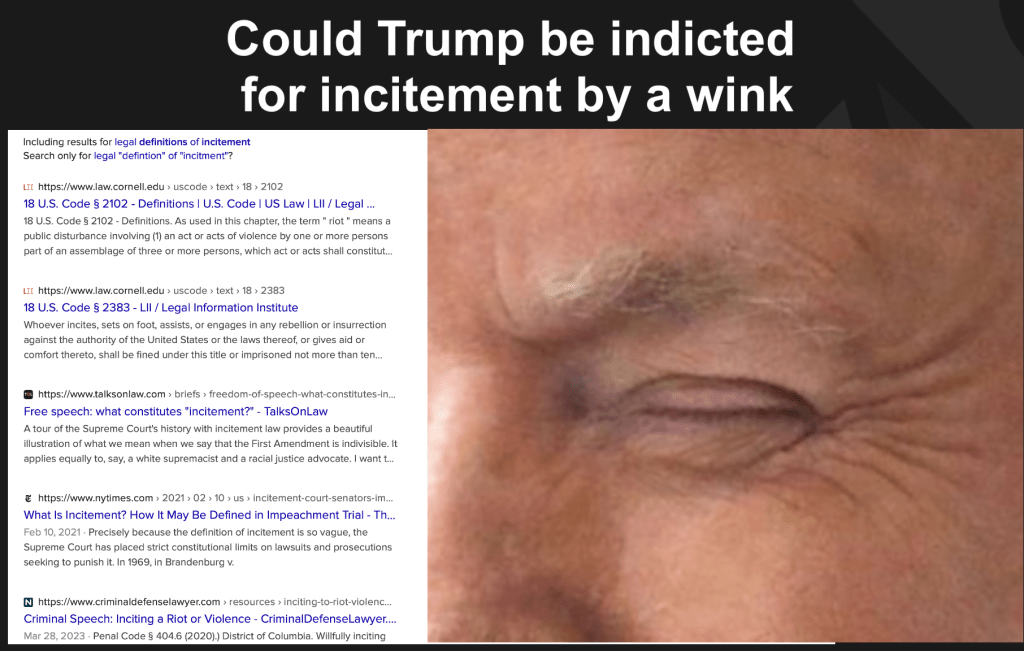 What Trump is doing is winking at his most zealous and prone to violence supporters when he tells them to be peaceful. I’d call this incitement by a wink.