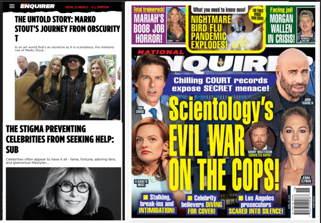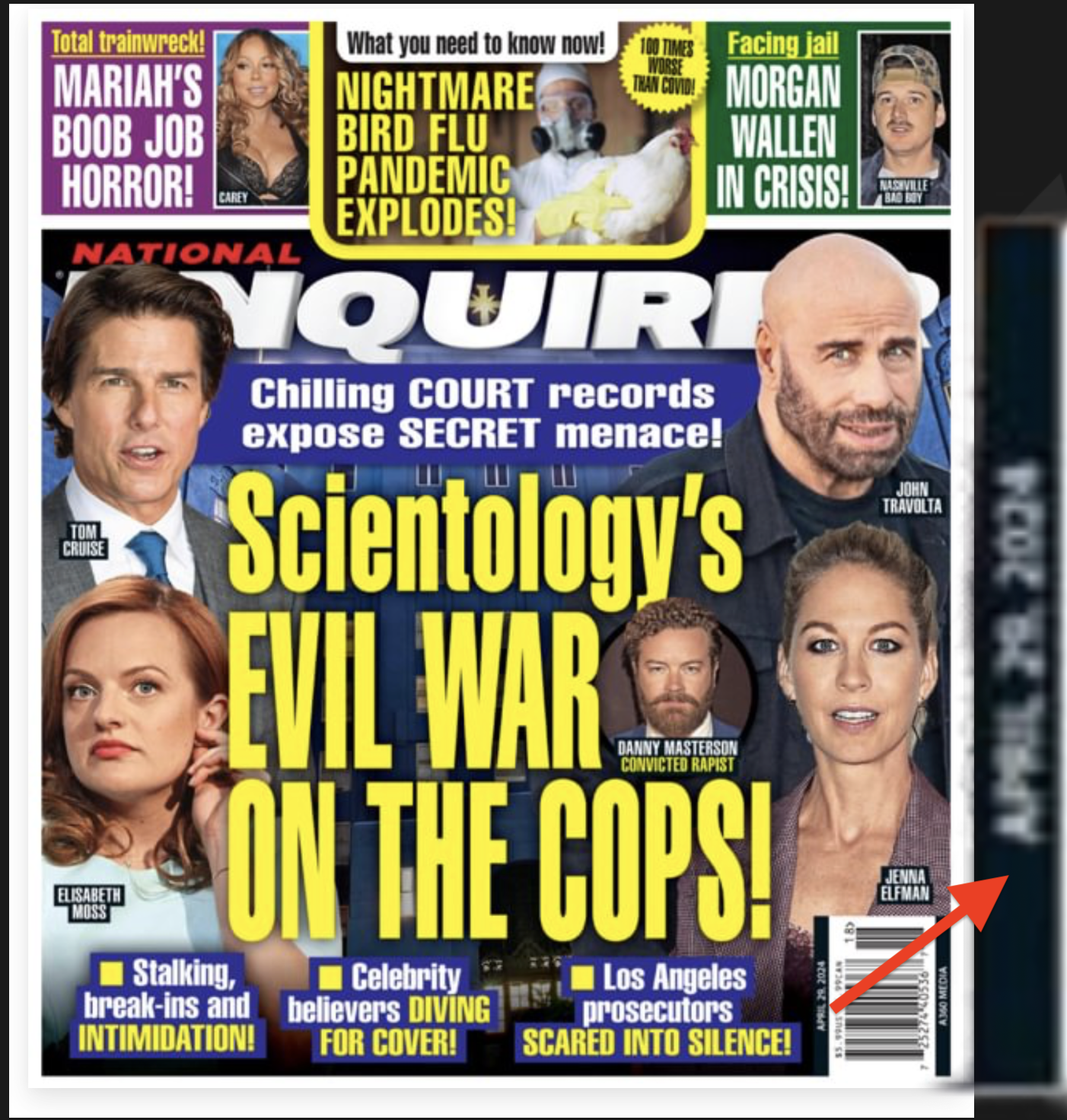 The featured print National Enquirer story is about Scientology which is hardly a hot topic these days. On the top it features Mariah Carey’s boobs next to an article about bird flu and Morgan Wallen who I never heard of.