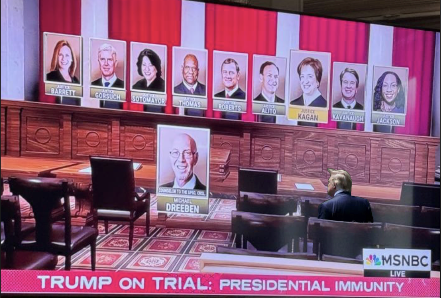 My illustration shows Trump in a seat near the front although he’d really be sitting in the section reserved for guests in the back or on the side (see Supreme Court website).