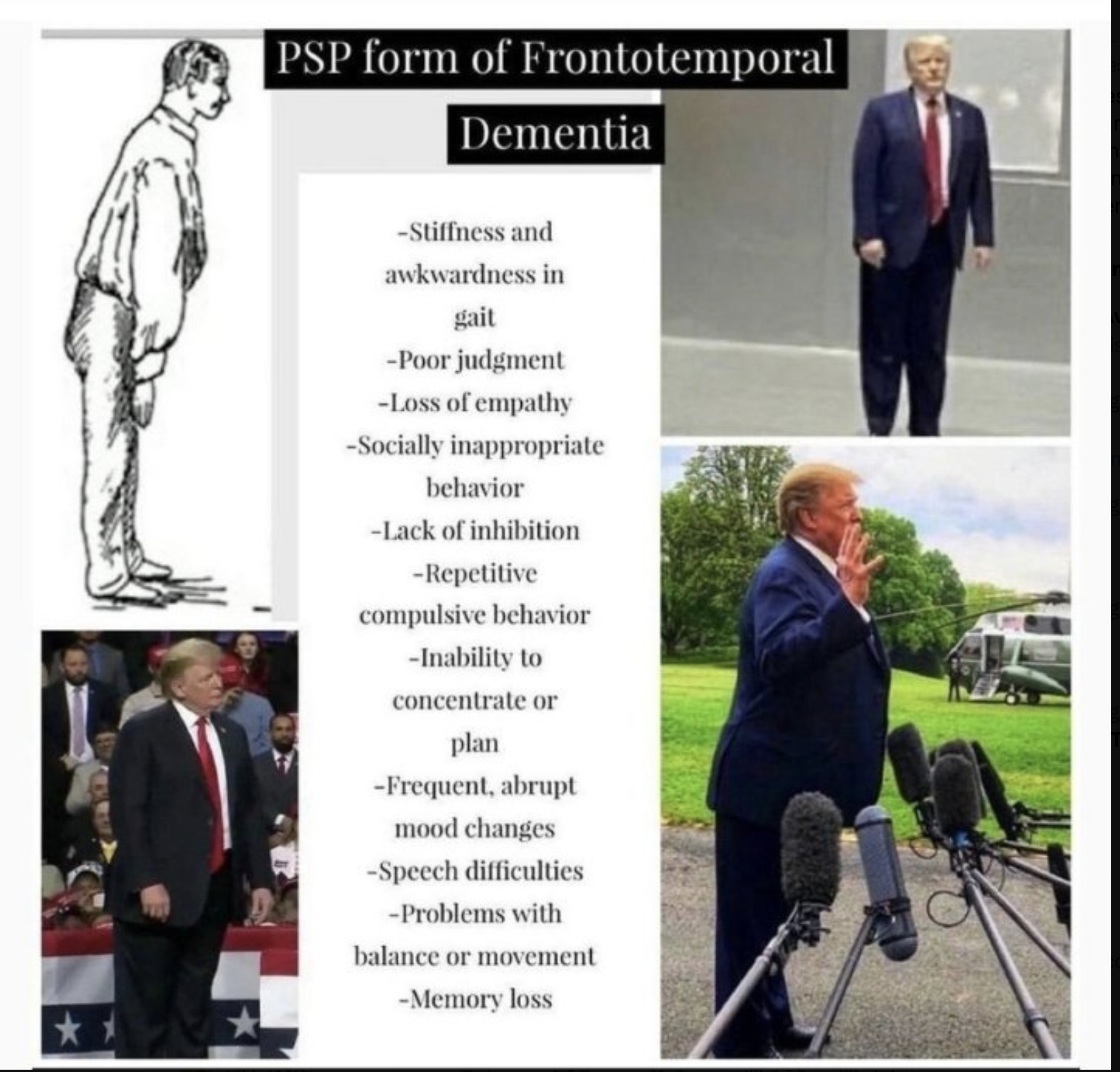 Other users suggested the same diagnosis with photos of the 2024 frontrunner and a list of symptoms, including “poor judgment,” “socially inappropriate behavior,” “loss of empathy” and “problems with balance.”