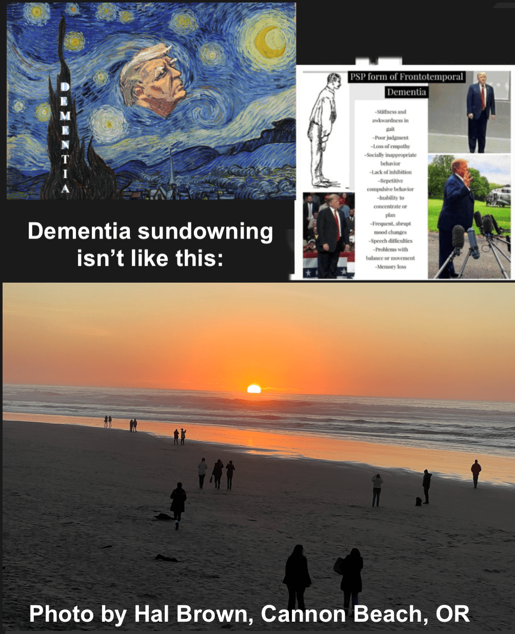 Trump has mixed up words and shown indications of early dementia in his afternoon speeches. I haven’t seen any videos of Trump speaking in the evening. What we are all familar with are his posts to Truth Social many of them made in the wee hours of the morning. These are where the most indications of cognitive impairment are evident.