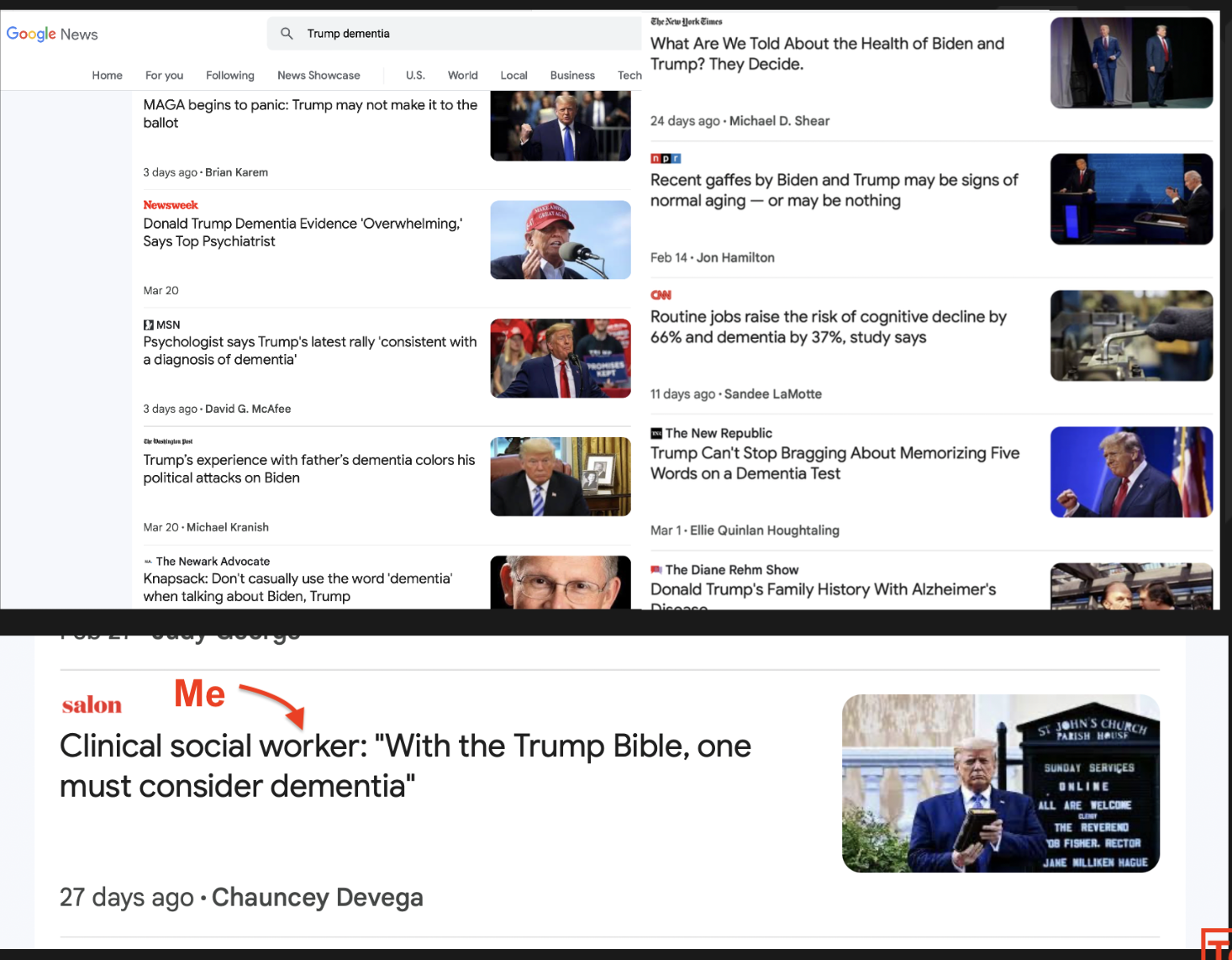 Others, like me in the Salon article “Clinical social worker: “With the Trump Bible, one must consider dementia”, have made a case for diagnosing him as having early dementia.Look up Trump and dementia here.