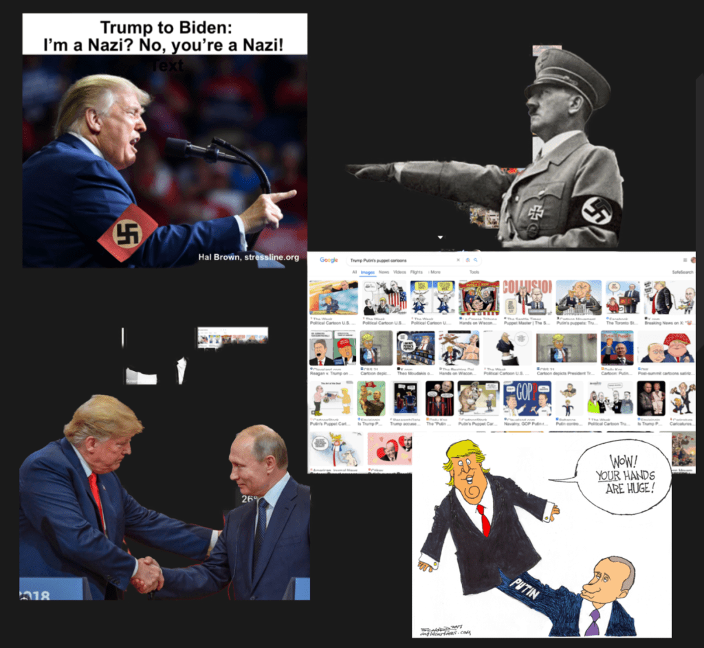 Trump also called Biden the Manchurian candidate. The plot of the book and movie aside this has come to mean “a person, especially a politician, being used as a puppet by an enemy power. The term is commonly used to indicate disloyalty or corruption, whether intentional or unintentional.” (Reference) I don’t have to make an illustration referencing this since there are numerous cartoons of Trump being Putin’s puppet (here).