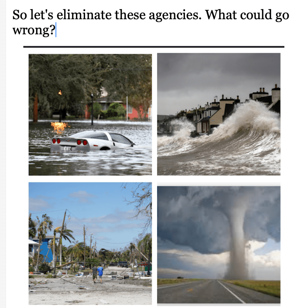 “Break up NOAA,” the document says, referring to the National Oceanic and Atmospheric Administration and its six main offices, including the 154-year-old National Weather Service.